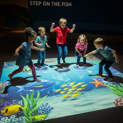 «Шаги по рыбе» — наш блокбастер. Проектор проецирует яркую подводную сцену — рыбы скользят, пузырьки пузырятся, волны колышутся. Ваша миссия? Топтать этих скользких пловцов, чтобы «поймать» их, в комплекте со звуками всплесков и уклоняющимися маневрами.